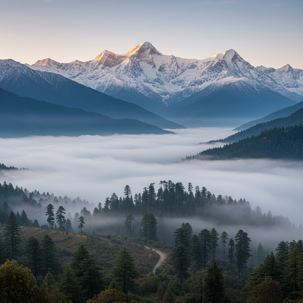 Serene early morning view of the majestic Himalayas, where soft mist gently envelops lush pine forests, creating a tranquil and mystical landscape.