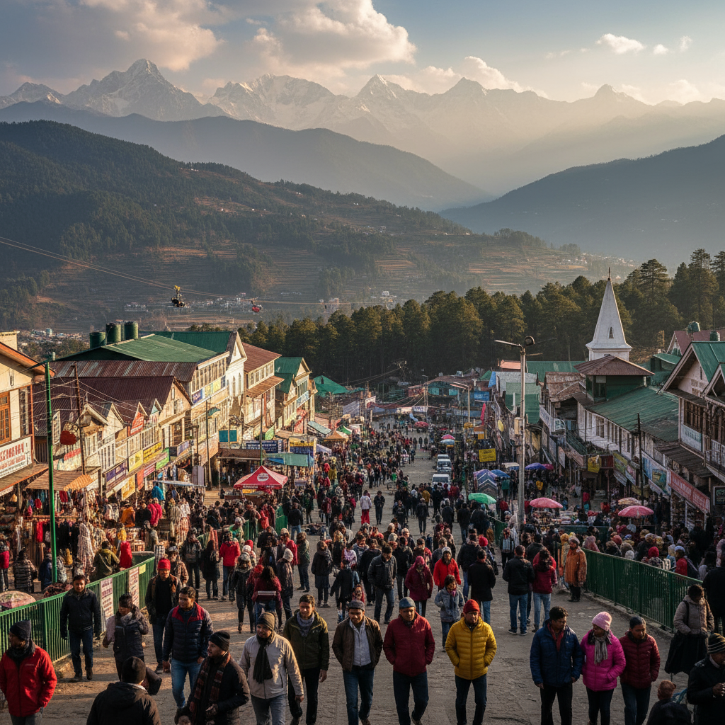 Vibrant Shimla Mall Road bustling with tourists, set against the lively atmosphere and sweeping panoramic vistas from Kufri Adventure Park, showcasing the charm and excitement of Himachal Pradesh’s popular hill station.