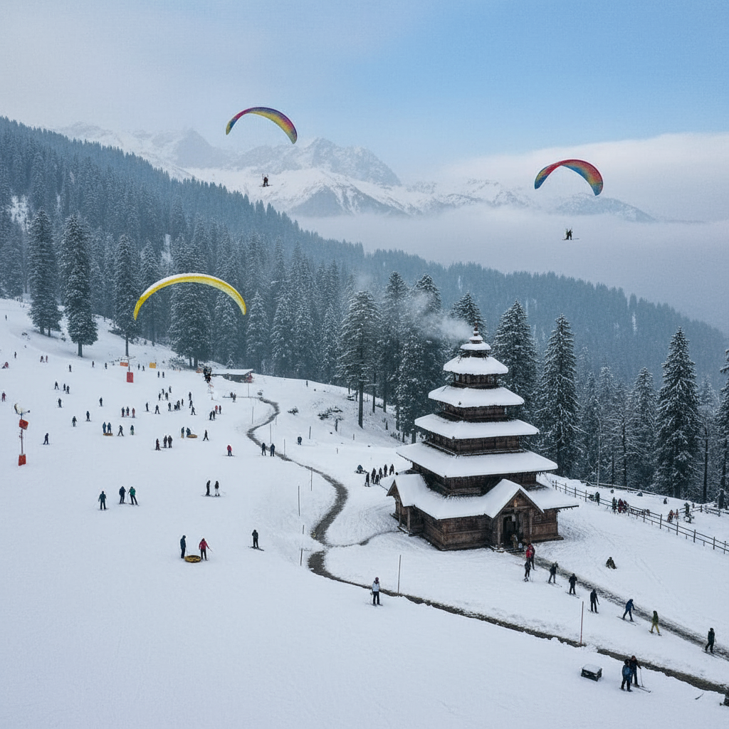 Thrilling snow activities in Solang Valley unfold against a stunning winter landscape, while the historic Hadimba Temple stands serenely nestled amid ancient cedar forests, capturing the unique allure of Manali’s highland region.