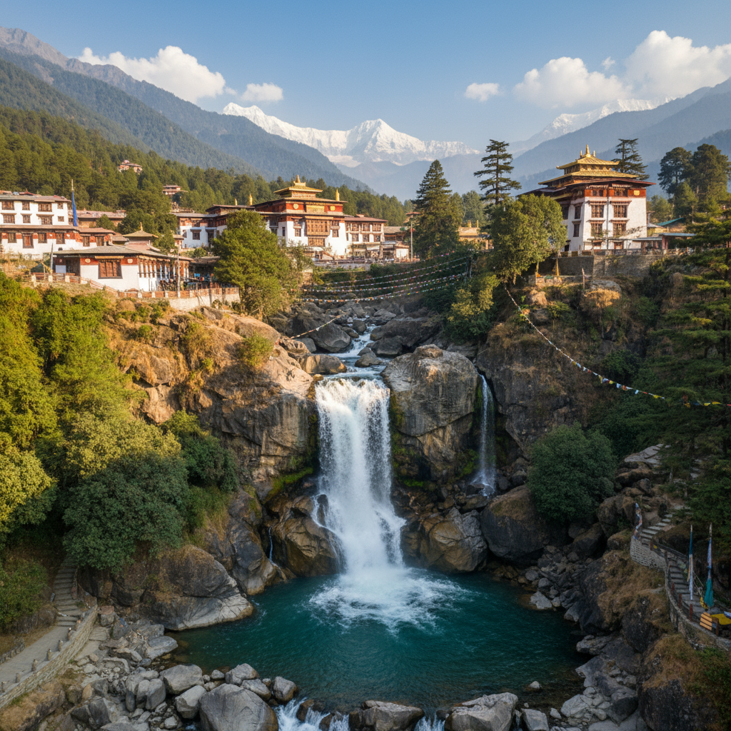 Majestic Dalai Lama Temple nestled in the hills, with the serene Bhagsu Falls cascading gracefully over rugged rocks nearby, capturing the tranquil and spiritual essence of Dharamshala’s iconic landmarks.
