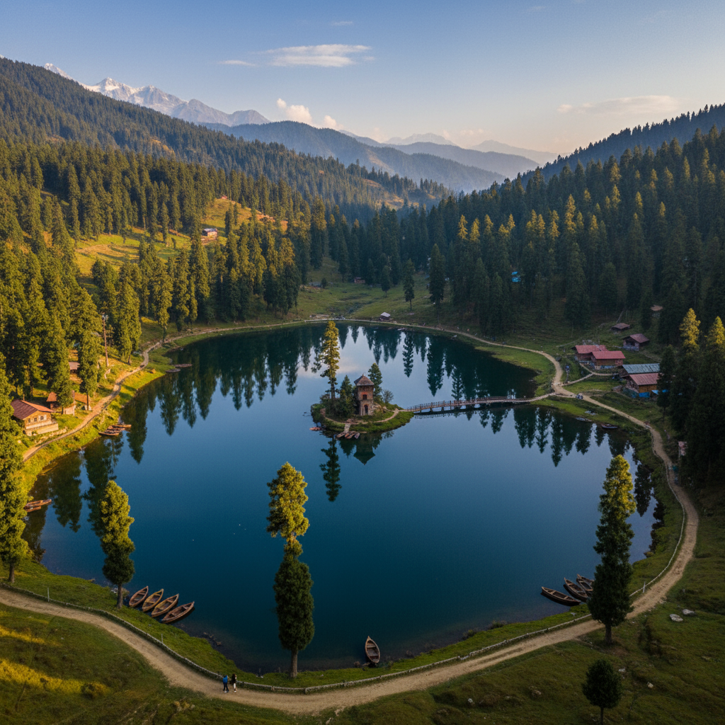 Breathtaking panoramic view of Khajjiar Lake, its tranquil waters encircled by lush green meadows and towering pine forests, often called the “Mini Switzerland of India” for its enchanting natural beauty.