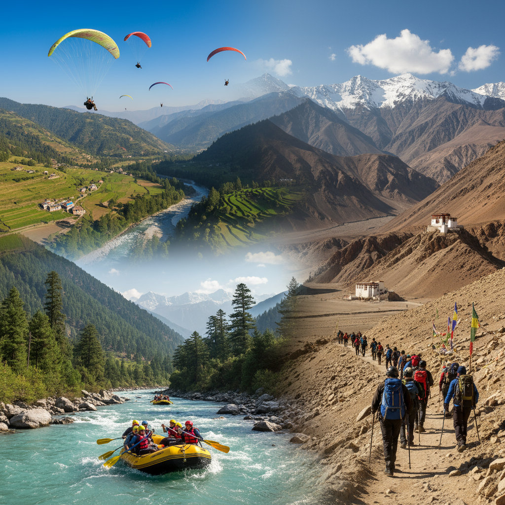 Thrilling paragliding above Bir-Billing skies, exhilarating river rafting in Kullu’s rushing waters, and intrepid trekkers exploring the dramatic trails of Spiti Valley—showcasing Himachal Pradesh’s ultimate adventure destinations and vibrant outdoor spirit.