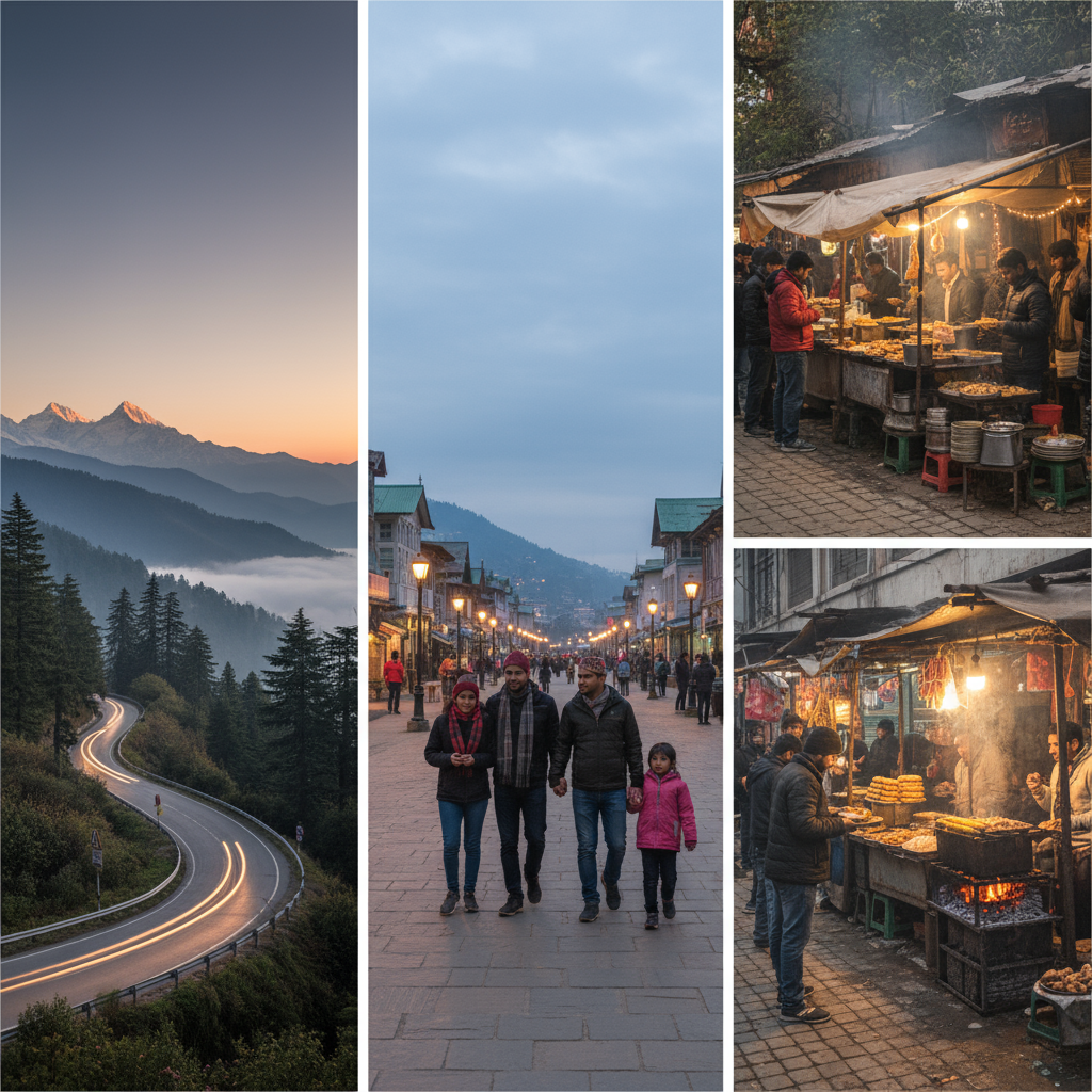 Picturesque drive winding between Shimla and Manali, lively evening strolls along the illuminated Shimla Mall Road, and bustling local food stalls serving authentic mountain flavors—capturing the essence of Himachal’s travel charm and vibrant street life.