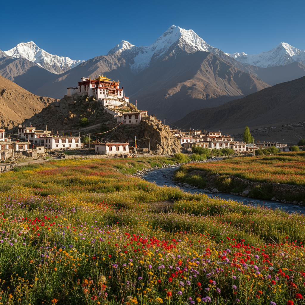 Sangla Valley alive with vibrant spring blooms, the majestic Key Monastery perched above Spiti’s dramatic terrain, and lively village scenes full of traditional Himachali culture, cuisine, and festive celebrations.