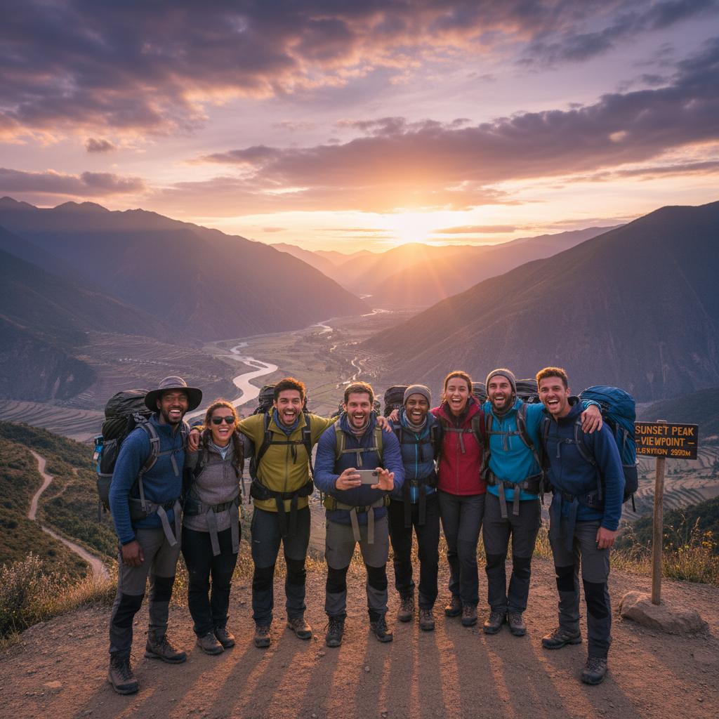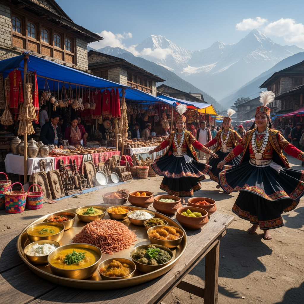 A vibrant Himachali thali showcasing authentic mountain flavors, bustling local craft markets filled with handmade treasures, and dancers adorned in traditional dress performing lively folk dances—celebrating the cultural richness and culinary delights of Himachal Pradesh.Joyful tourists soaking in panoramic views from a scenic viewpoint, an adventurous group posing mid-trek, and a spectacular sunset illuminating the valleys—capturing the spirit of exploration, camaraderie, and natural beauty in Himachal Pradesh.